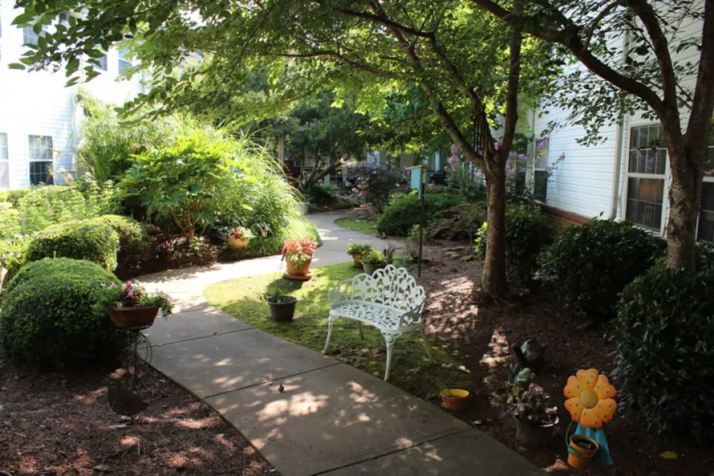 Summerset Assisted Living Community of Atlanta has a thoughtfully designed building that welcomes natural light. The community offers a family-style environment, complete with courtyards, gardens, walkways, a fountain, a goldfish pond, flowering shrubbery, and trees to enjoy. The architecture is modern and traditional, creating a warm and welcoming atmosphere.